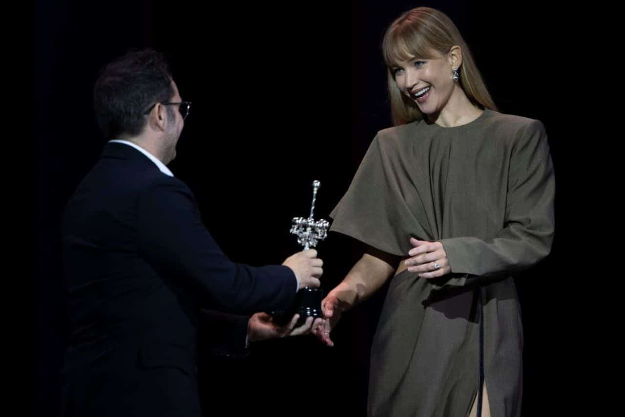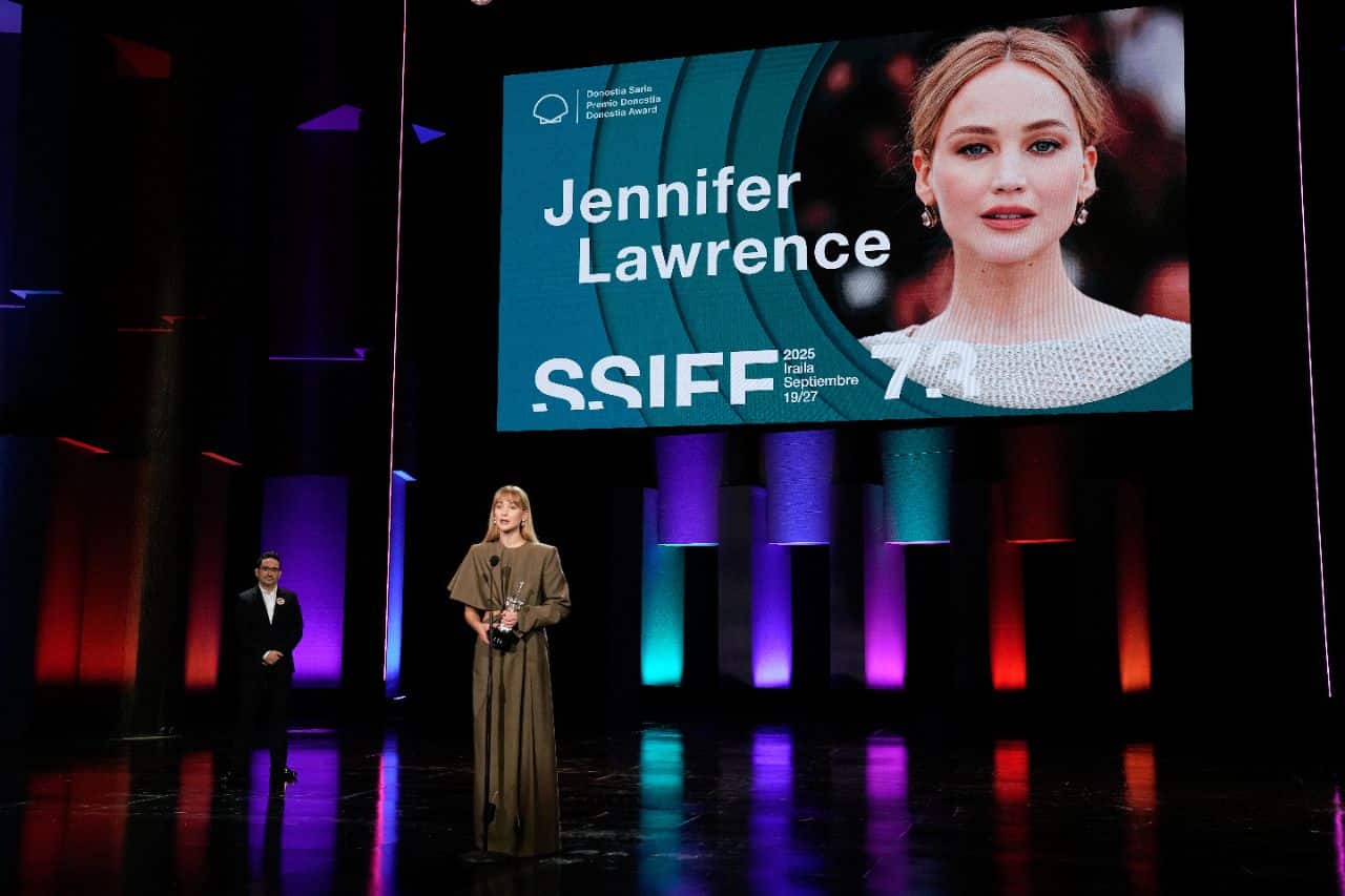 Jennifer Lawrence fue recibida con aplausos en el Auditorio Kursaal al recibir el galardón honorífico. Es la galardonada más joven en la historia del Donostia, a sus 35 años. La entrega del premio coincidió con la presentación de su film Die My Love, en el que también participa como productora.